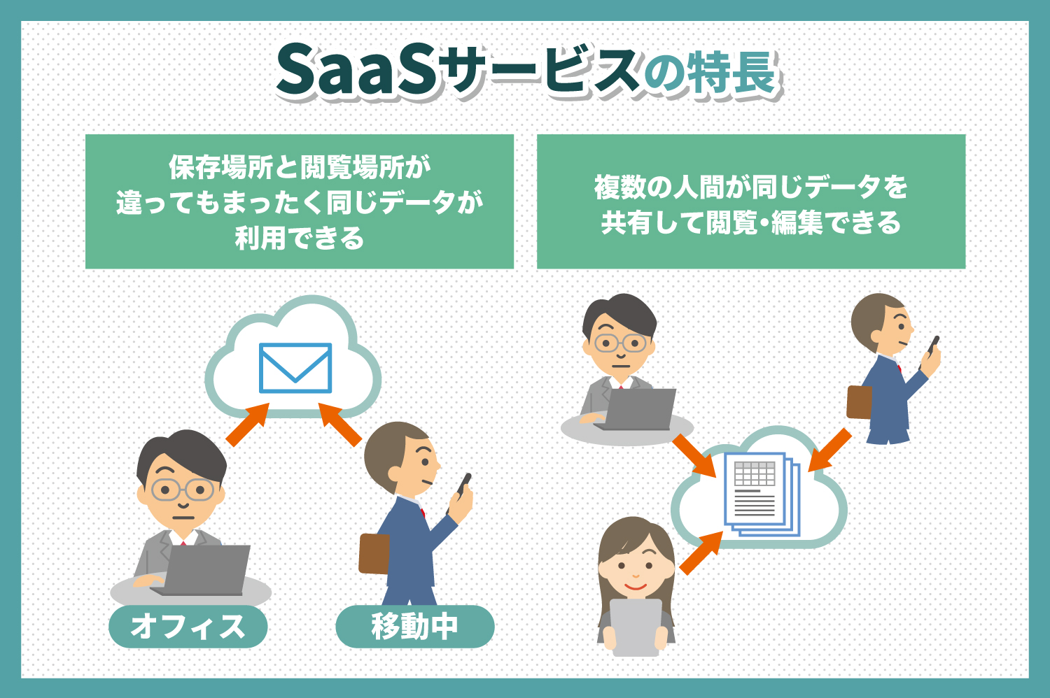例えば、SaaSではデータをクラウドに保存するため、オンプレミスサービスと違って保存した場所と閲覧する場所が違っても全く同じデータが利用可能です。作業を途中で中断して移動し、移動した先でまた作業を再開する際などにも活用できるでしょう。