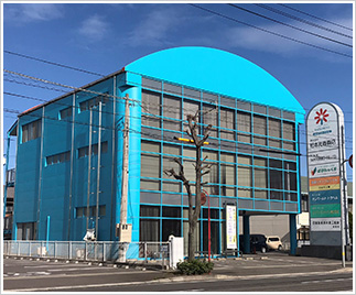 ブルーの外観が映える高松市内に位置する松本光春商店の本社社屋。
